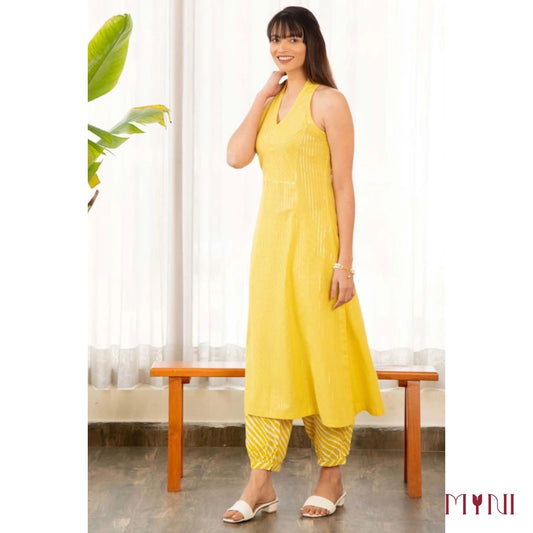 Butter Yellow Halter Neck Floral Print Cotton Kurta Set