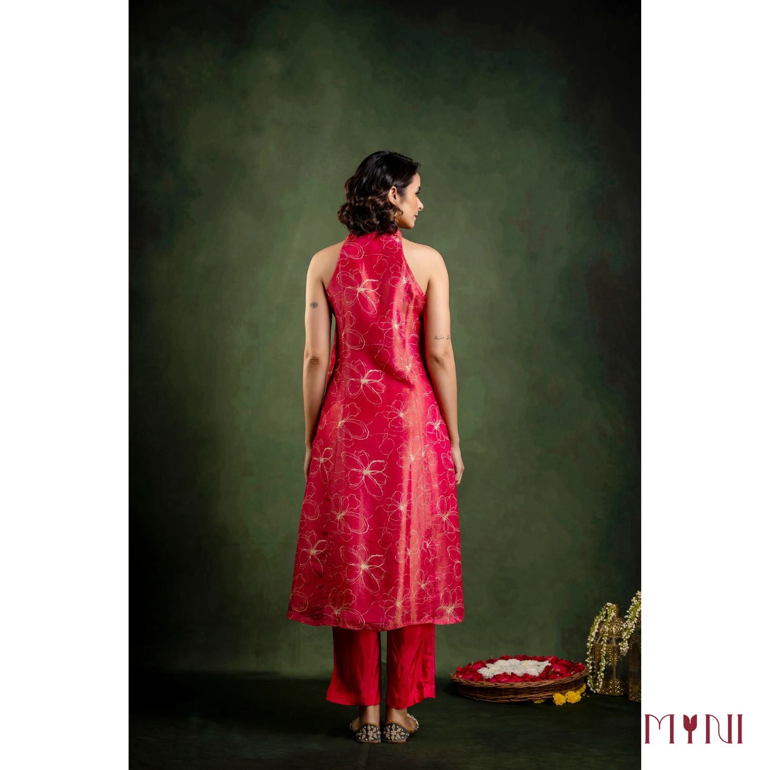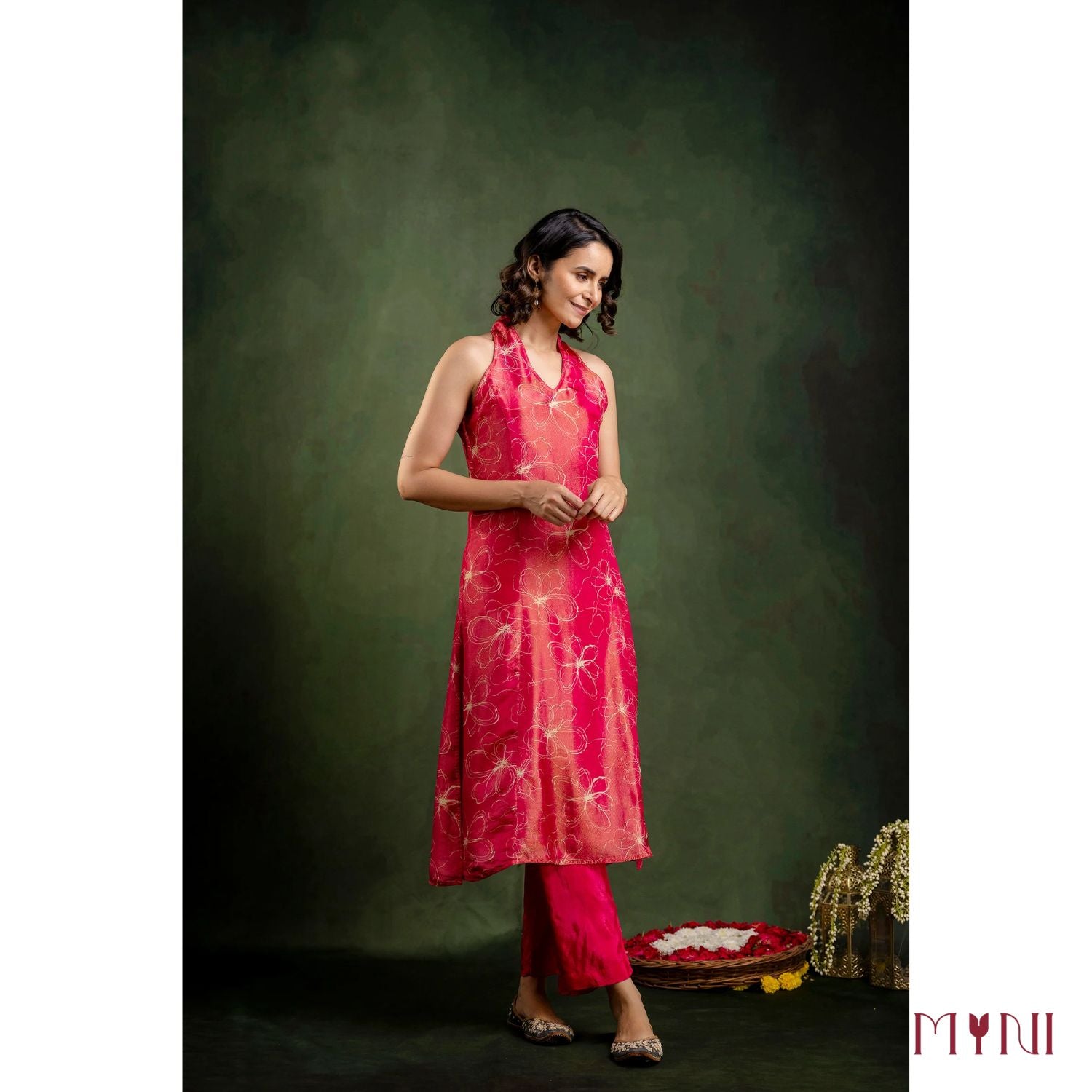 With its perfect blend of traditional design and contemporary flair, the Rosy Shimmer Halter Neck Kurta with Pant is a must-have for anyone seeking to make a statement with effortless elegance.